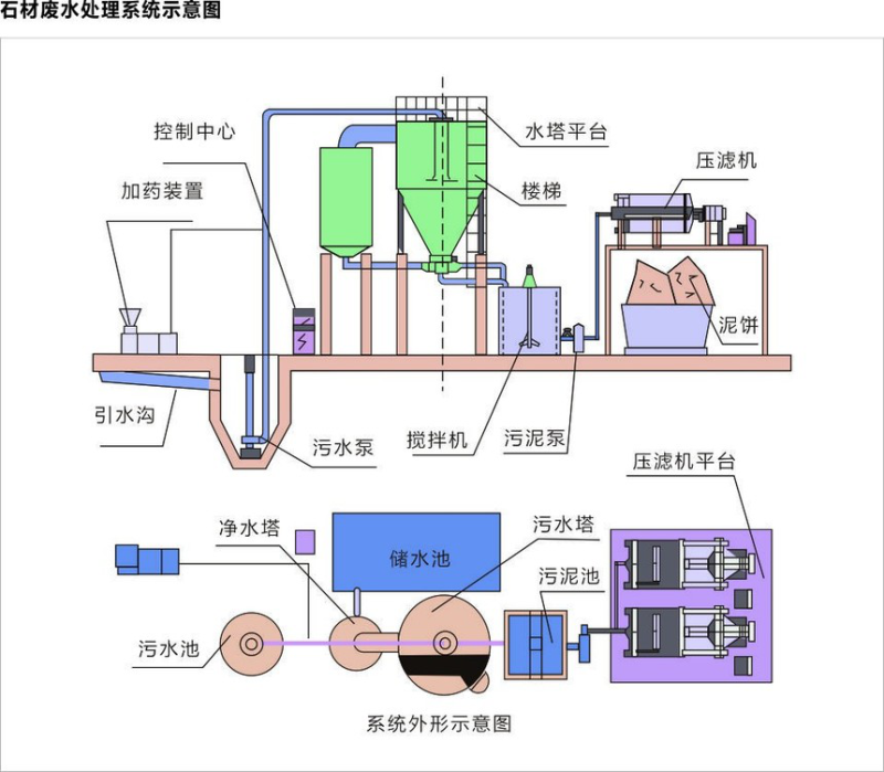 石材切割機(jī)、砂鋸機(jī)、拋光機(jī)等排放出來的污水匯流到污水池,通過污水泵提升到污水速沉塔,同時加藥機(jī)把藥劑與自來水或處理后的污水按比例配制好后,由計(jì)量泵定量注入污水管,隨同污水送入速沉塔。塔內(nèi)污水因藥液的化學(xué)絮凝作用而發(fā)生聚合加速沉淀,懸浮液在塔內(nèi)分層,上部較清澈,下部較渾濁。上層清水溢流到凈水塔,下層污水(泥)間歇排放到污泥池。凈水塔底部污水長時間排放到污泥濃縮池一次。污泥池內(nèi)污泥經(jīng)攪拌均勻后由污泥泵提升到壓濾機(jī)進(jìn)行壓榨過濾。污泥在壓濾機(jī)各濾室內(nèi)形成比較干燥的濾餅,濾餅外運(yùn)填埋處理。經(jīng)壓濾機(jī)過濾后的清水和凈水塔上部排放的清水流入儲水池循環(huán)利用。