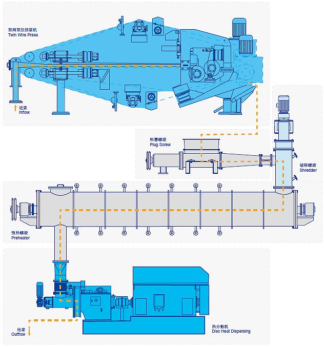 盤式熱分散系統(tǒng)能有效地對廢紙漿料中的膠粘物、油脂、石蠟、塑料、橡膠或油墨粒子等雜質(zhì)進行分散處理,以改進紙張的外觀質(zhì)量,提高紙張性能。該系統(tǒng)主要包括:漿料濃縮設(shè)備(雙網(wǎng)雙壓擠漿機或斜螺旋擠漿機和螺旋擠漿機)、料塞螺旋、破碎螺旋、預(yù)熱器、盤式熱分散機。熱分散系統(tǒng)采用PLC自動控制,控制精度高。
