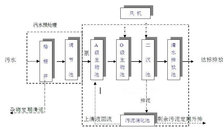一體化生活污水處理的設(shè)計(jì)主要是對(duì)生活污水和相類似的工業(yè)有機(jī)污水的處理,其主要處理手段是采用目前較為成熟的生化處理技術(shù)接觸氧化法,水質(zhì)設(shè)計(jì)參數(shù)也按一般生活污水水質(zhì)設(shè)計(jì)計(jì)算,按進(jìn)水平均為BOD5200mg/l計(jì),出水BOD5按20mg/l計(jì),共有六部分組成:(1)初沉池(2)接觸氧化池(3)二沉池(4)消毒池,消毒裝置(5)污泥池(6)風(fēng)機(jī)房、風(fēng)機(jī)組成。