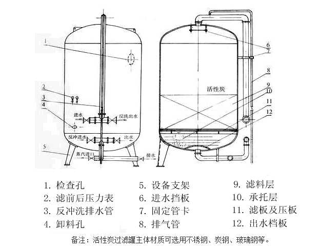 活性炭過濾器壓力容器是一種內(nèi)裝填粗石英砂墊層及優(yōu)良活性炭的壓力容器。