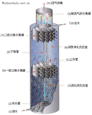 (3)抗沖擊負荷能力強:處理低濃度廢水(COD=2000~3000mg/L)時,反應器內循環(huán)流量可達進水量的2~3倍;處理高濃度廢水(COD=10000~15000mg/L)時,內循環(huán)流量可達進水量的10~20倍。大量的循環(huán)水和進水充分混合,使原水中的有害物質得到充分稀釋,大大降低了毒物對厭氧消化過程的影響。