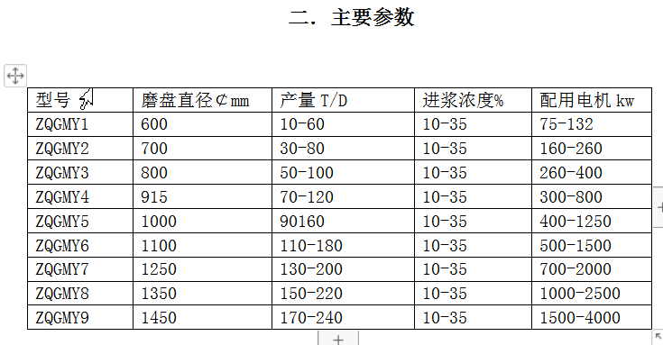 型號 磨盤直徑¢mm 產(chǎn)量T/D 進(jìn)漿濃度(百分比) 配用電機(jī)kw
